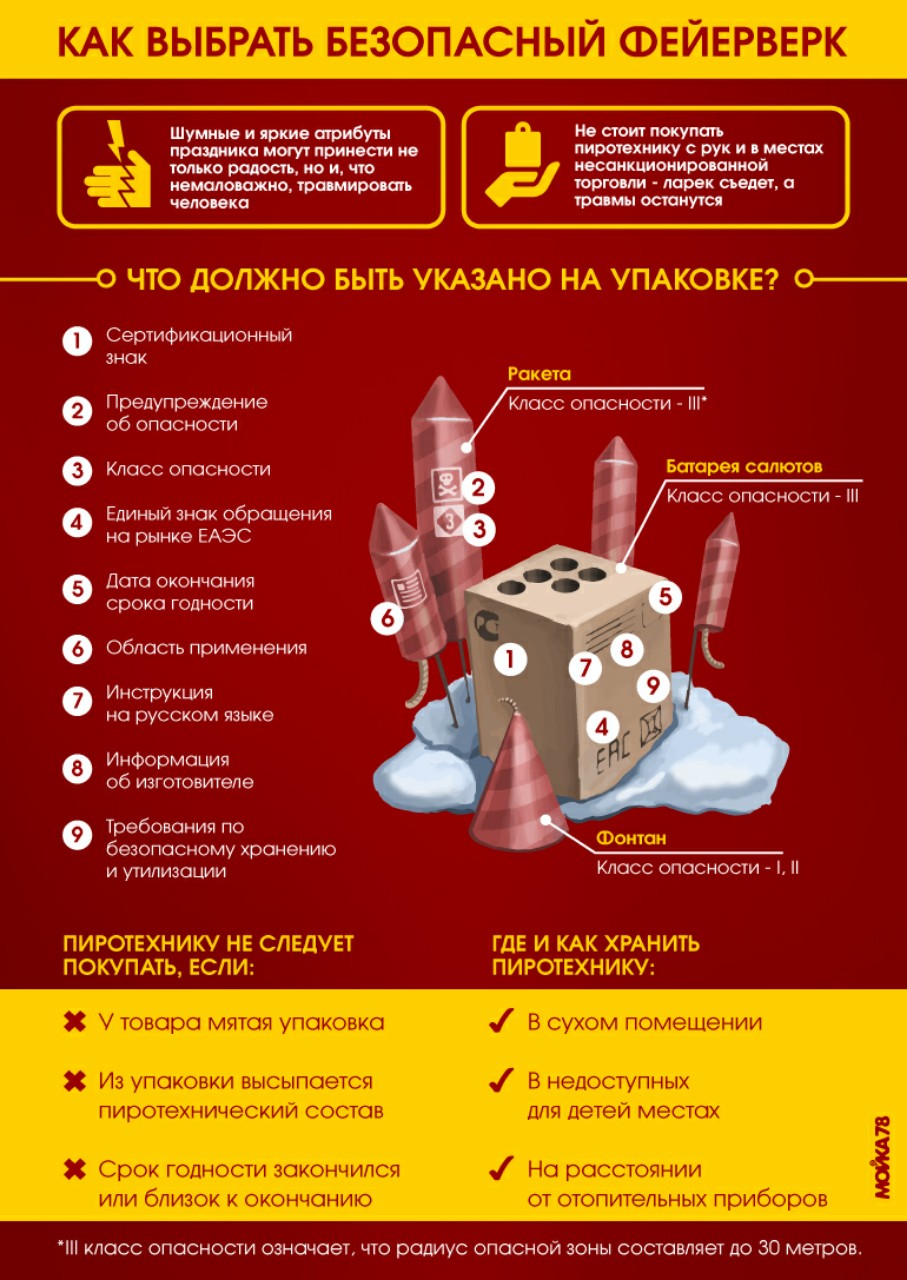 1.Пиротехника и фейерверки должны быть сертифицированы. У организации, которая занимается их продажей, должны быть документы, подтверждающие качество продукции. Следует приобретать товар у проверенных и надёжных продавцов, занимающихся открытой торговлей и имеющих всю необходимую документацию.